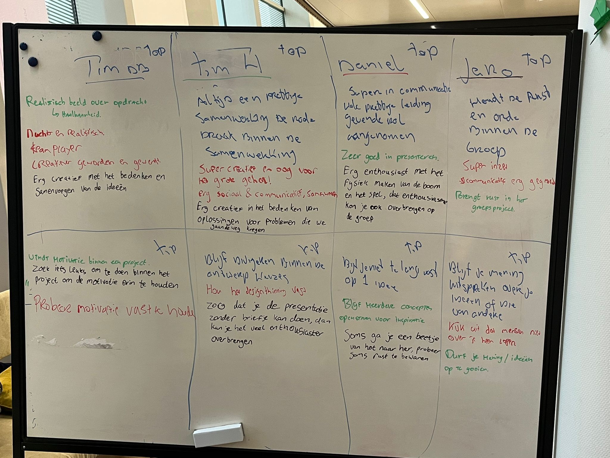 Ook de ‘Sparkle’ opzoeken binnen een studio is iets wat ik heb meegekregen vanuit mijn tussentijdse evaluatie gesprek, en ben actief bezig om die ook te zoeken tijdens de studio. Bij deze studio was deze zeker aanwezig en vond ik het erg leuk om eraan te werken! We zijn echt fysiek aan de slag gegaan en elkaar gemotiveerd om lekker aan de slag te gaan. Ook hielp het enorm om zulke enthousiaste opdrachtgevers te hebben, dit maakt het werken voor de opdrachtgever nog wat even leuker, en zorgt ervoor dat je nog even een stapje verder gaat. Het werken in teamverband en coachen van medestudenten is iets waarmee ik bezig ben geweest indien nodig. Het teamverband was erg fijn tijdens deze studio en de dynamiek in de groep was erg fijn!