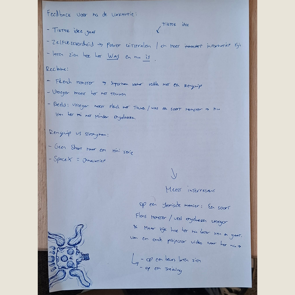 Uit de feedback kregen we bruikbare info, bijvoorbeeld: dat de tiktok trend waarschijnlijk niet zal werken omdat hier je doelgroep niet ziet, of de beurs dat al aardig lastig is omdat er al een grote beurs gehouden wordt en we niet duidelijk hebben hoe die eruit ziet. Wel was het flens monster zeer interessant en vond hij het vet hoe die eruit zag en was hij benieuwd wat je daar nog verder mee kon doen.