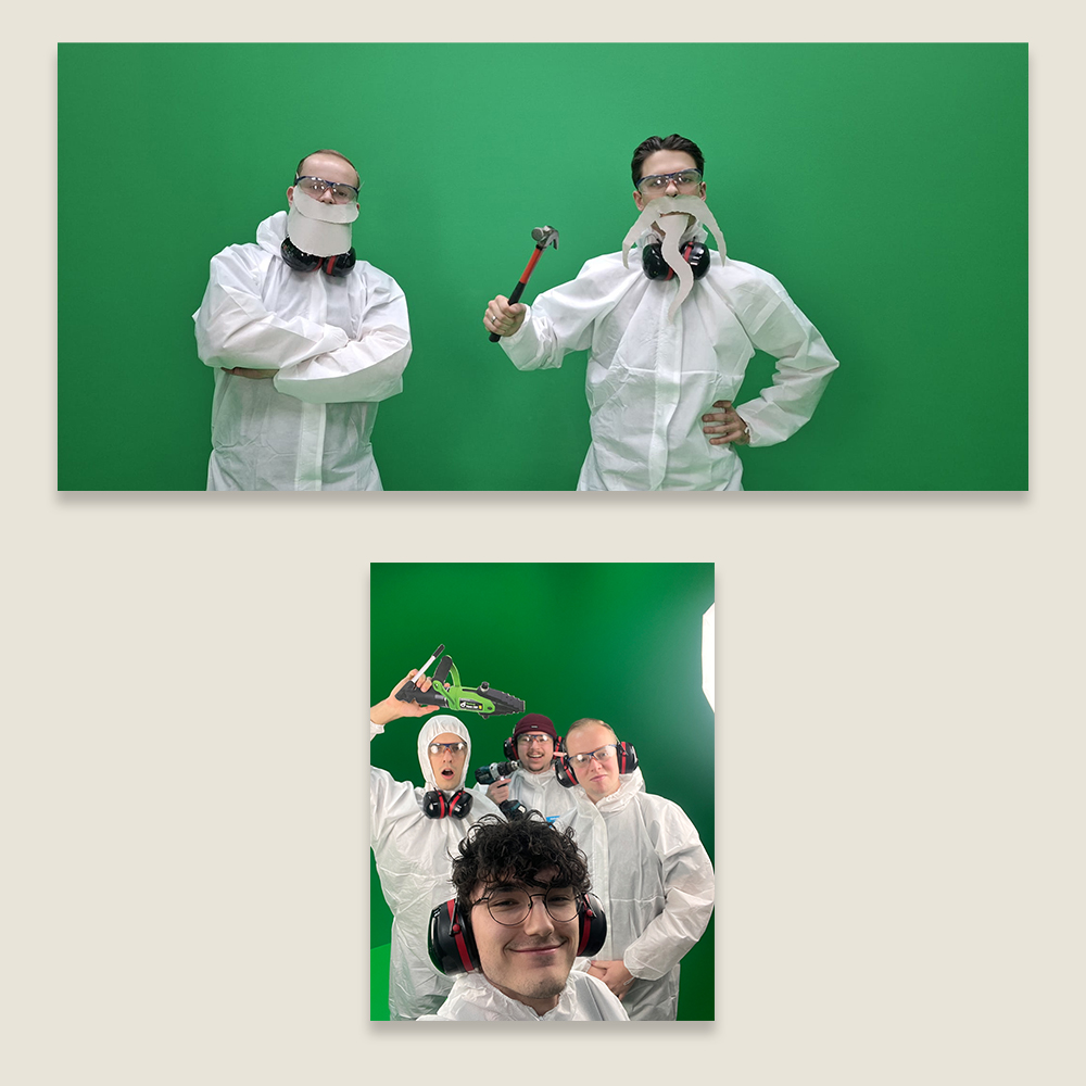 Eerst waren we van plan om alles met AI te gaan maken, tot de personages aan toe. Tot Janko op het idee kwam om de video zelf met ons erin te gaan schieten met een green screen. Hier zijn we nog een beetje over gaan nadenken en discussiëren. Maar dit was een leuk idee! Dus hier zijn we nog verder op gaan brainstormen en zijn wij aan de slag gegaan.